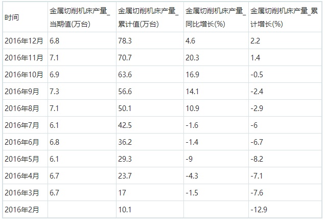 2016年金屬切削機(jī)床累計(jì)產(chǎn)量78.3萬臺(tái)